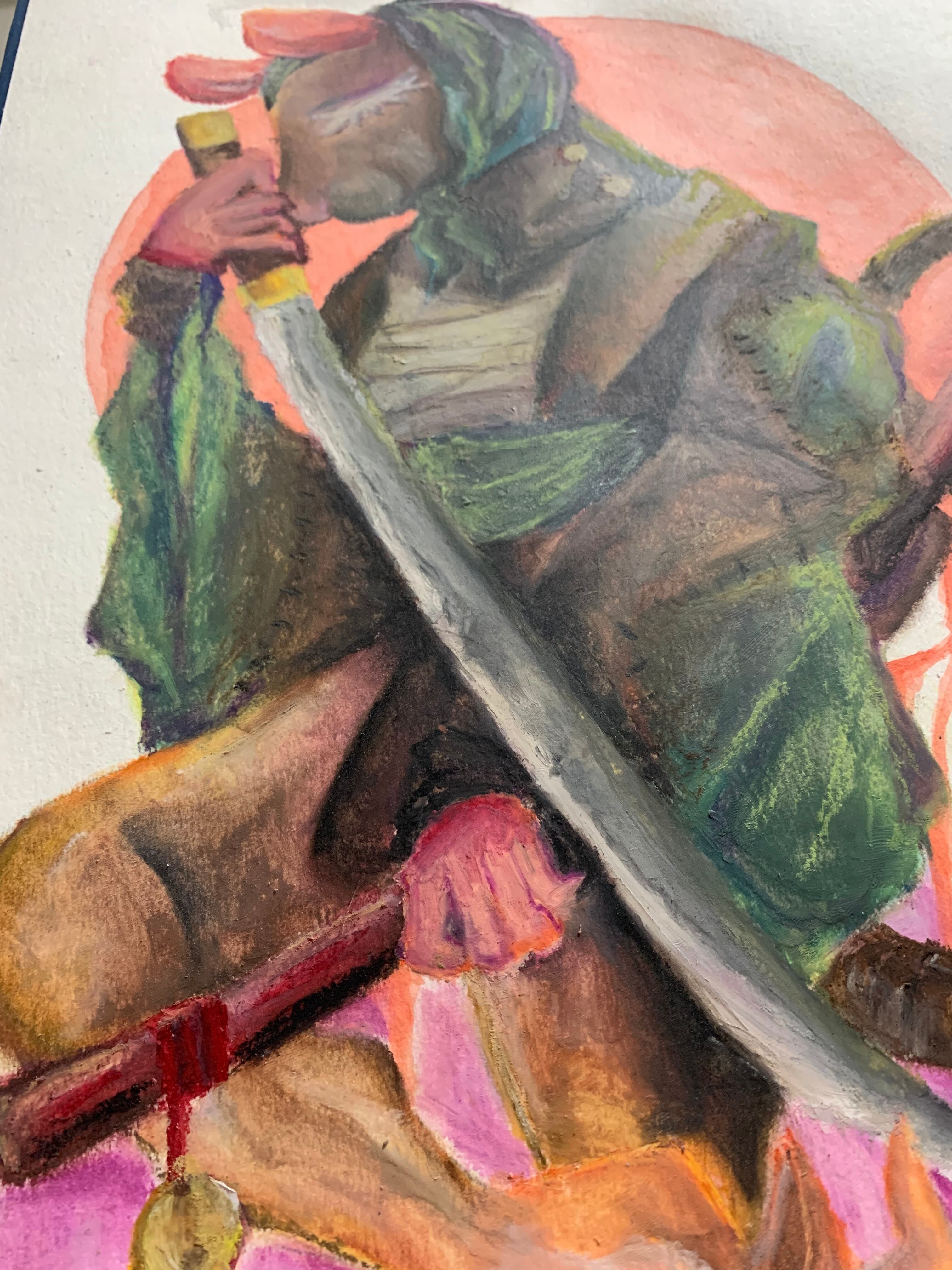 オイルパステルで描かれたねずみの女性の女座頭市。