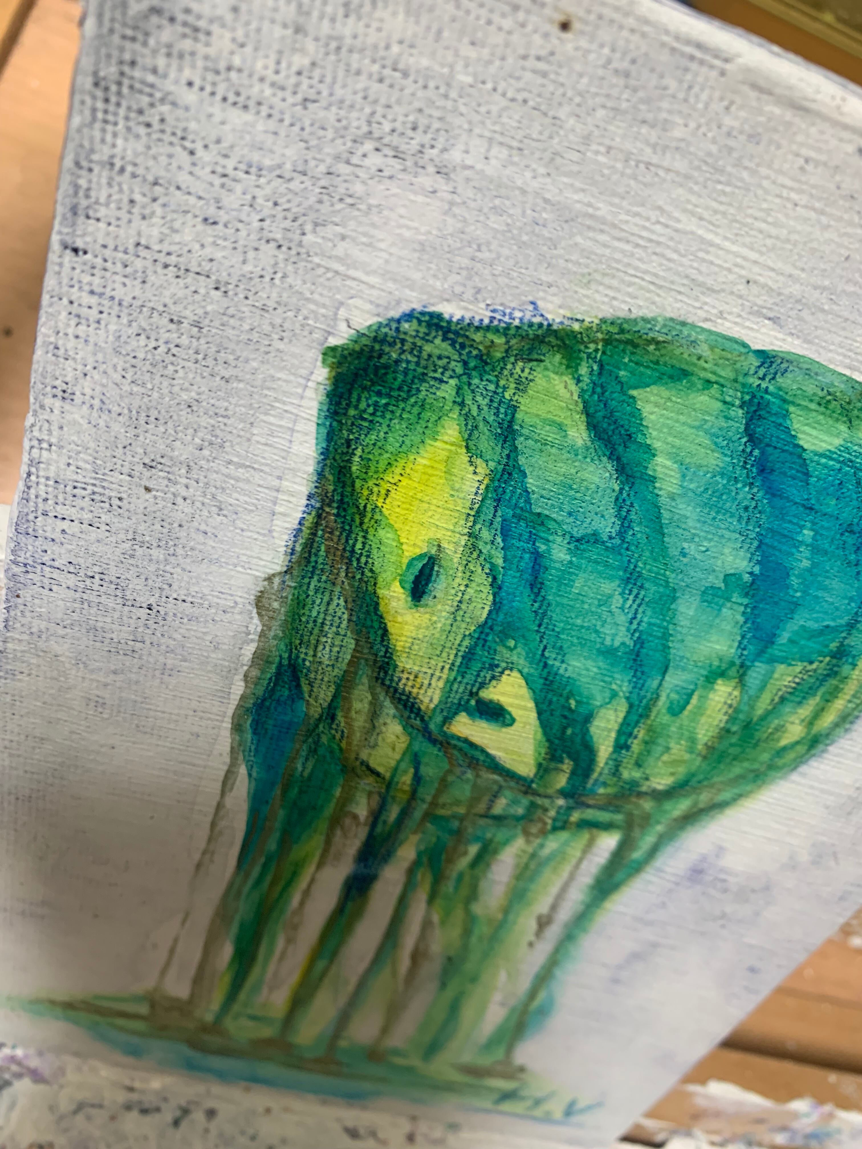 使用画材 胡粉ジェッソ 顔彩 透明水彩(ホルベイン透明水彩 クサカベグラニュレーションカラー) 油性色鉛筆(ファーバーカステルゴールドファーバー)